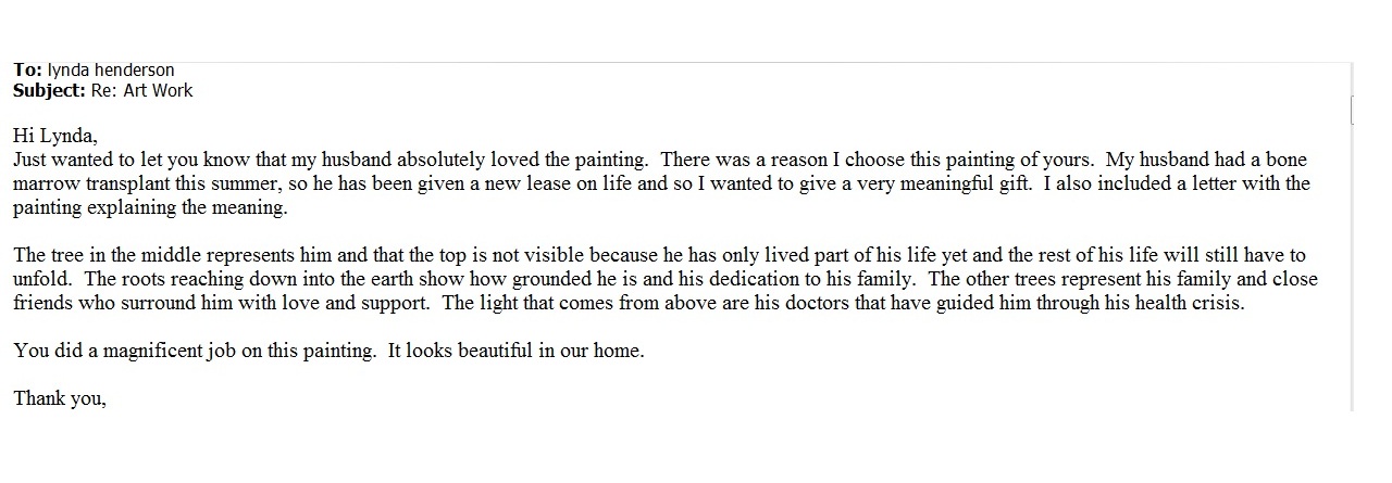 Just wanted to let you know that my husband absolutely loved the painting. There was a reason I choose this painting of yours. My husband had a bone marrow transplant this summer, so he has been given a new lease on life and so I wanted to give a very meaningful gift. I also included a letter with the painting explaining the meaning.